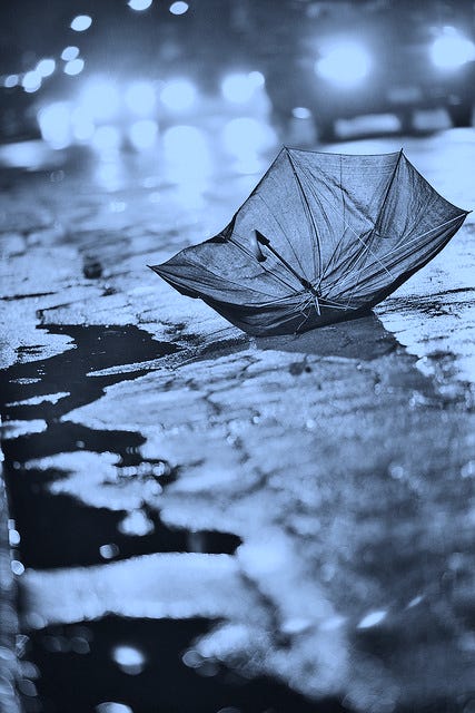 "Hey!" she yelled, picking herself up off the cement and kicking at the mangled umbrella. "Can't you bloody-well watch where you're walking?!" He blubbered unintelligibly as she inspected the shallow scrapes on her right hand. "Fucking moron!" she barked, then checked her clothing to find that she had torn her third pair of stockings that week and had scuffed both her jacket and skirt. "Asshole!" she cursed and flipped him the finger. Then she muttered to herself "And just when I was about to pack it in after a God damned slow night." She stopped herself from cursing him a third time because, in part, she saw that his head was shorn — something she has always found odd but appealing in men — but mostly because she had looked into his sad eyes and, despite the coldness of the street lamp and the rain pouring over his booze-bleared eyes, she thought she recognised in them something which brought a lump to her throat.