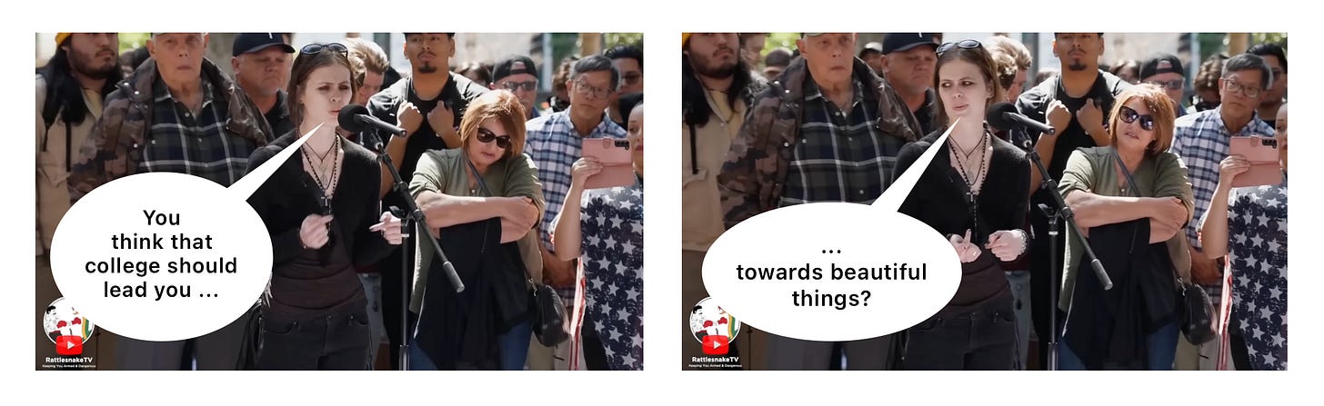 She is visibly stunned at the thought that it is a good idea, even if possible, to pursue in school the concepts of the ‘good’, the ‘true’ and the ‘beautiful’ — difficult ones, of course! See “Charlie Kirk Educates Rude, Woke College Goth!” Late in this clip Kirk repeats to her and the crowd ‘~20:04 [Kirk:] We’re talking about college as a scam. And you’re a perfect example, like one of the very best…’ [student:] ‘Why thank you.’ [Kirk:] ‘… I’ve ever seen. To show the intellectual drivel that is taught on a college campus.’