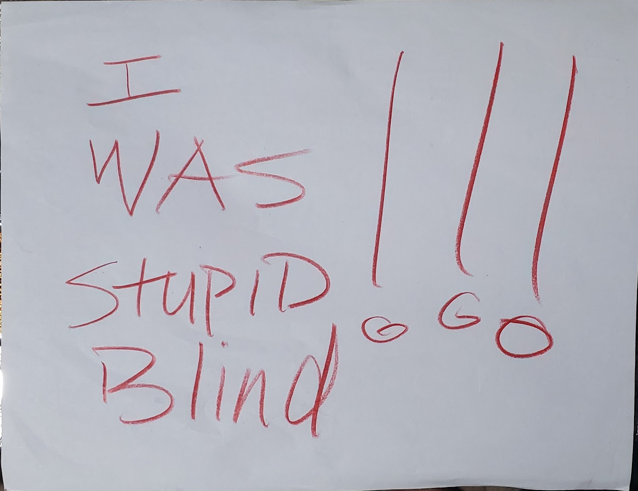 The other day I became angry with Yoshiko because of my inability to make myself understood with her. With that anger I scrawled it out in big red letters: “I WAS STUPID BLIND!”